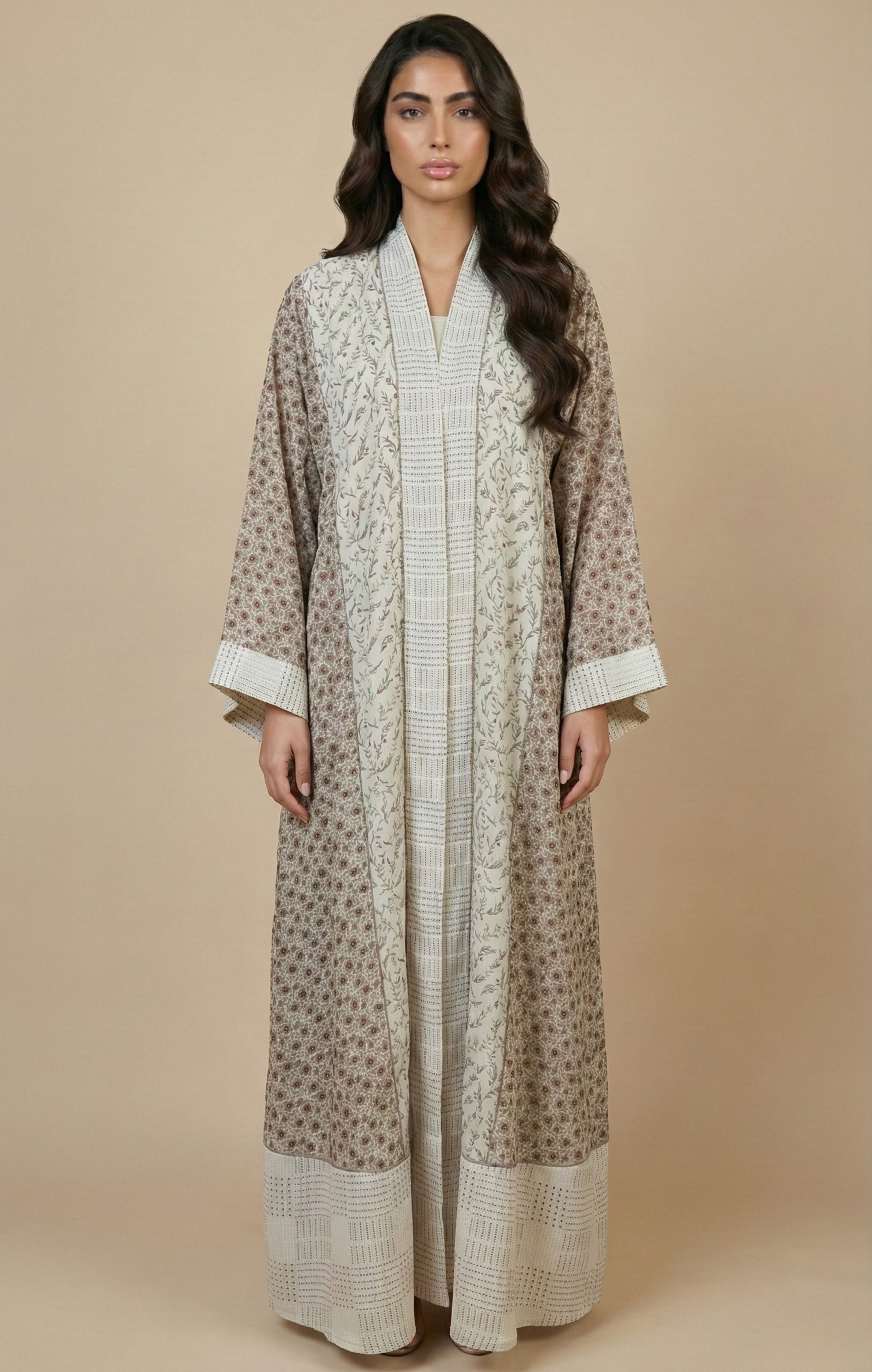 The outer layer is crafted from lightweight chiffon cotton, giving the abaya an airy feel and graceful movement. It is paired with a cotton linen inner dress, offering breathable comfort and a soft structure that feels effortless throughout the day. Together, these fabrics create a layered look that is light, comfortable, and ideal for warm climates.