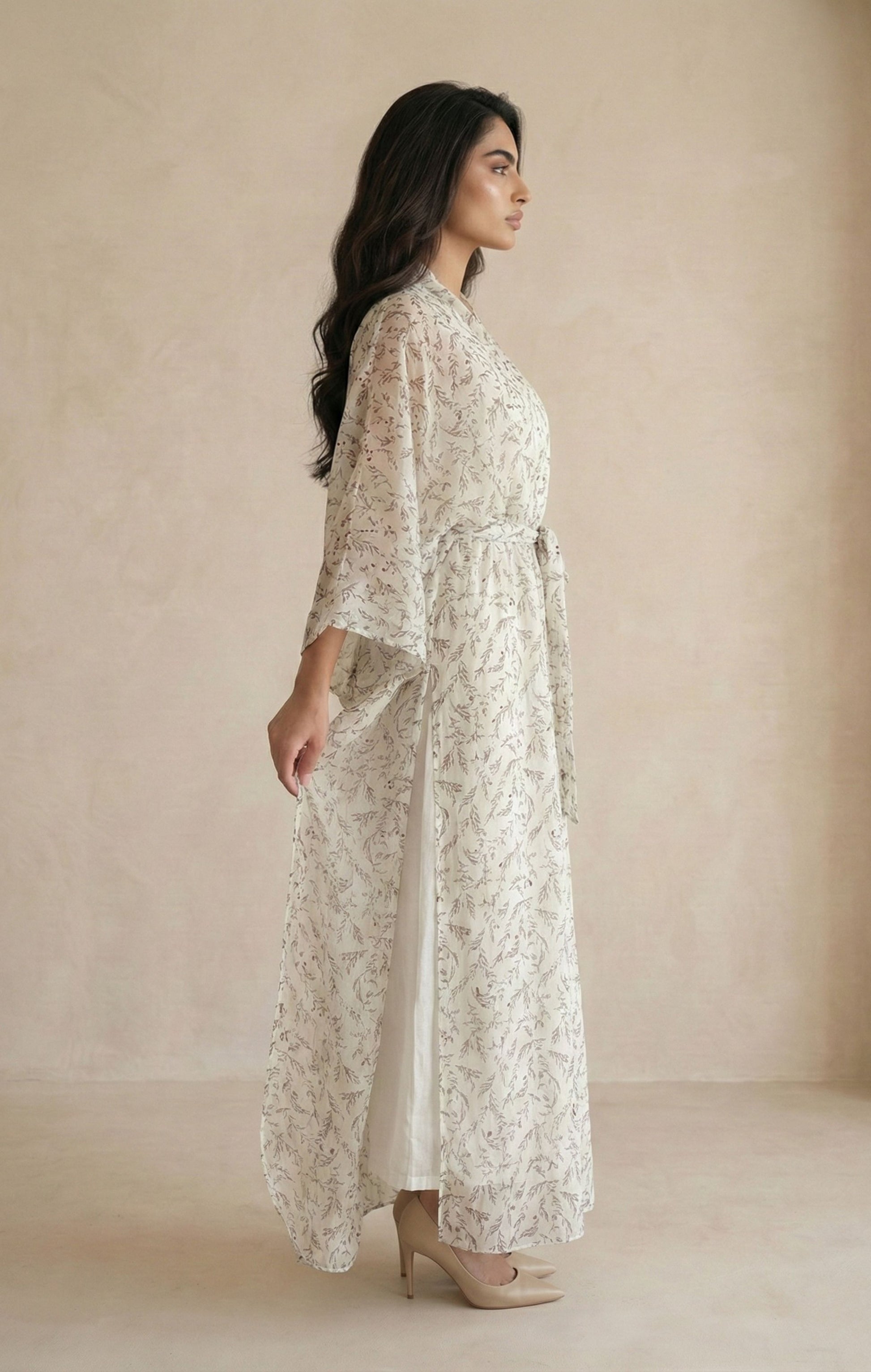 يتكوّن الكفتان من طقم قطعتين؛ طبقة خارجية مصنوعة من شيفون قطني خفيف يمنح القطعة حركة ناعمة وانسدالًا أنيقًا، مع فستان داخلي متناسق يوفر تغطية مريحة وسهولة في اللبس. حزام الخصر القابل للتعديل يسمح بتنسيق الإطلالة حسب الرغبة.