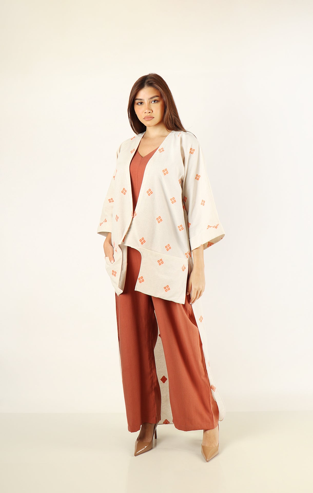 An elegant beige outerwear with orange patterns is paired with a burnt- orange colour jumpsuit made from premium rayon fabric. Perfect for effortless style and comfort in any setting.