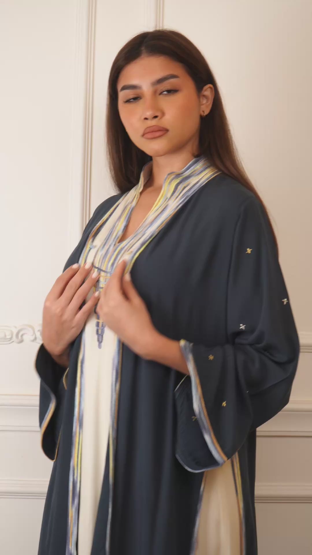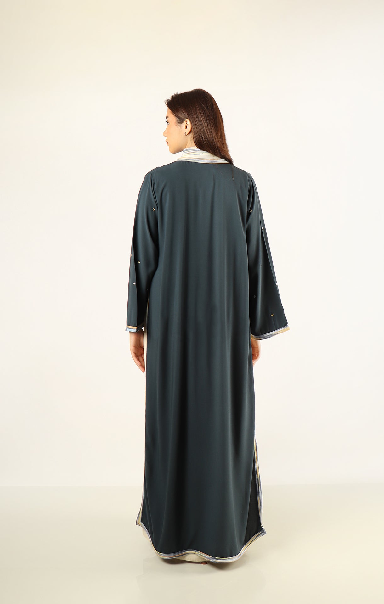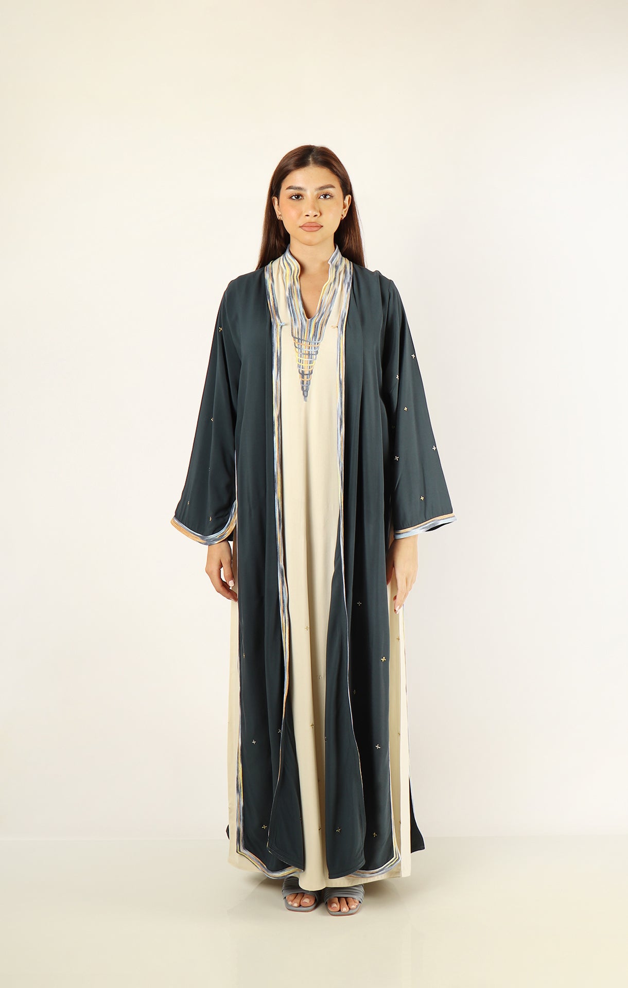 This elegant set features a stunning Deep Sea Grey dress paired with a matching abaya, both crafted from soft, high-quality cotton. The intricate hand-embroidery adds a beautiful, personal touch, making this set perfect for any occasion