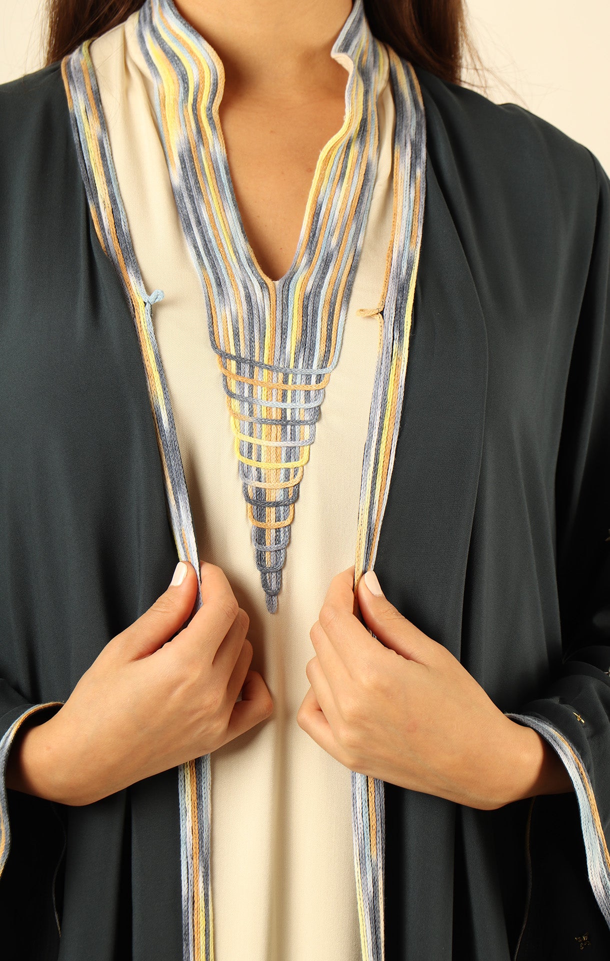 .طقم قطن باللون الرمادي الداكن يتكون من ثوب وعباية، مزين بتطريز يدوي لإطلالة راقية